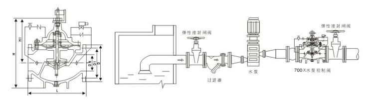 百鋼閥門集團生產銷售的700X水泵控制閥由主閥、電磁導閥、針閥、球閥、單向閥、行程開關、微形過濾器和壓力表組成水力控制接管系統。水泵需停止工作時,先由進口壓使主閥關閉90%后,水泵停止運轉。剩余10%由回水關閉。可防止水錘現象發生。